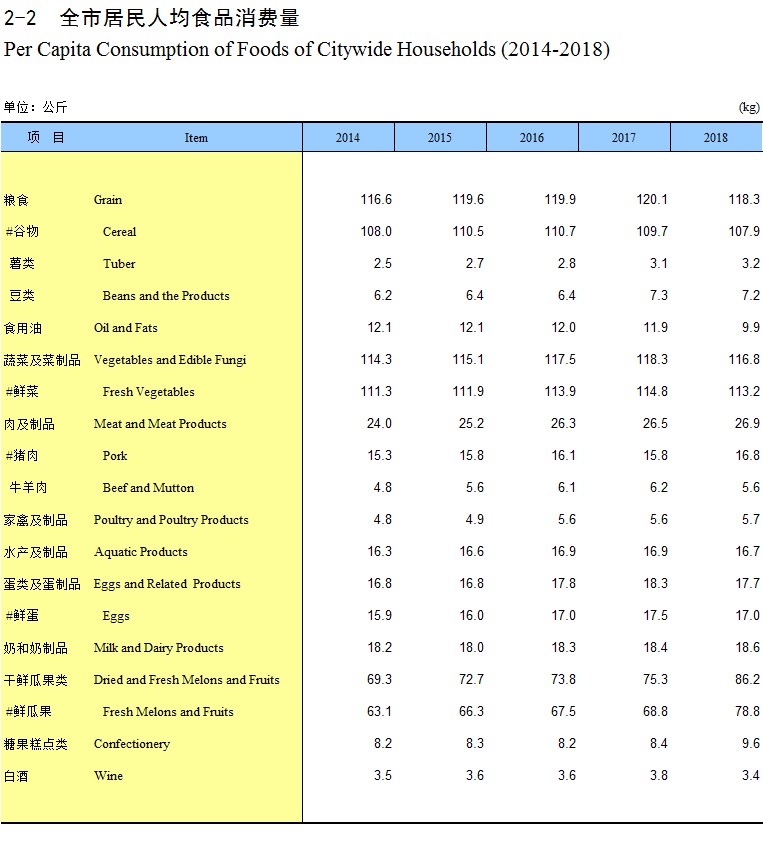 2-2 全市居民人均食品消费量(2014-2018)