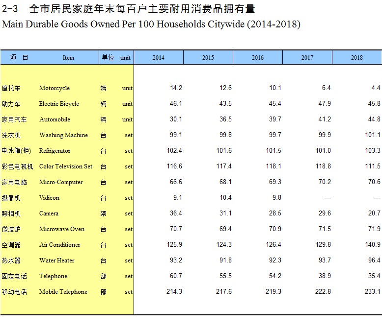 2-3 全市居民家庭年末每百户主要耐用消费品拥有量(2014-2018)