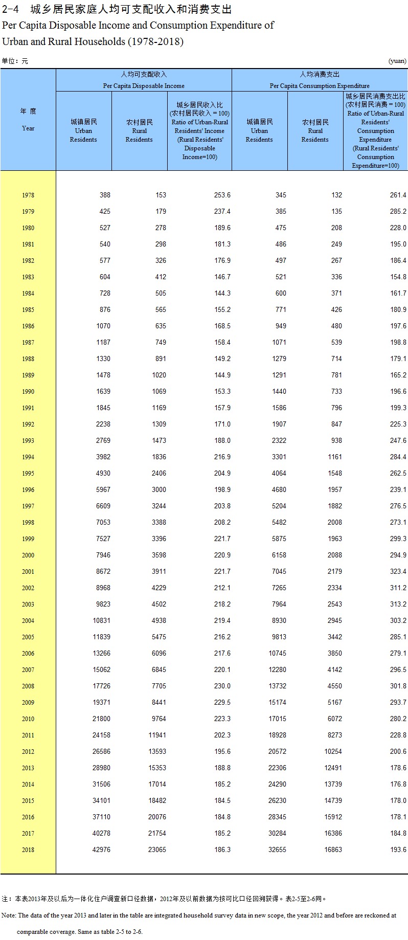 2-4 城乡居民家庭人均可支配收入和消费支出(1978-2018)