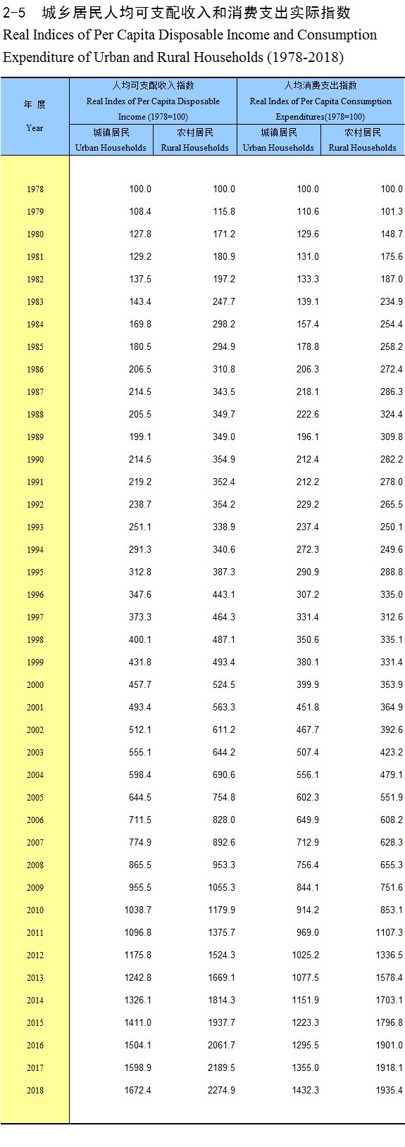 2-5 城乡居民人均可支配收入和消费支出实际指数(1978-2018)