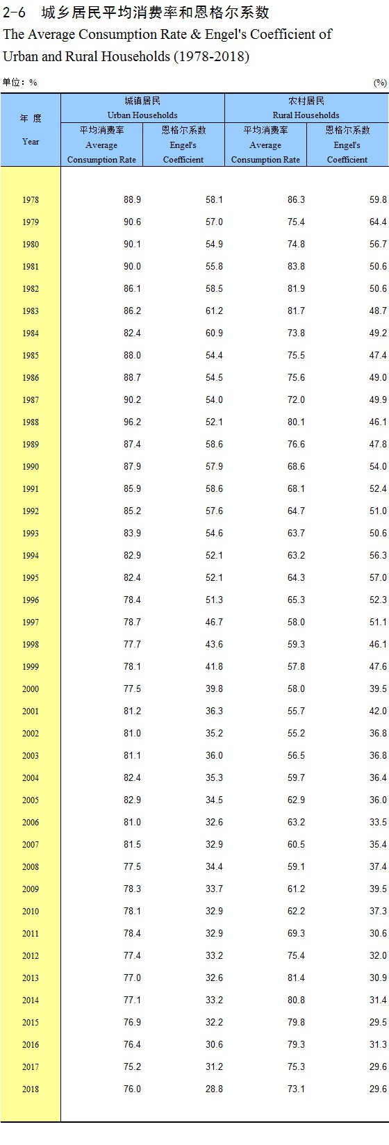 2-6 城乡居民平均消费率和恩格尔系数(1978-2018)