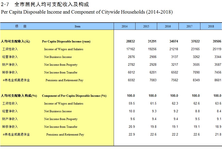 2-7 全市居民人均可支配收入及构成(2014-2018)