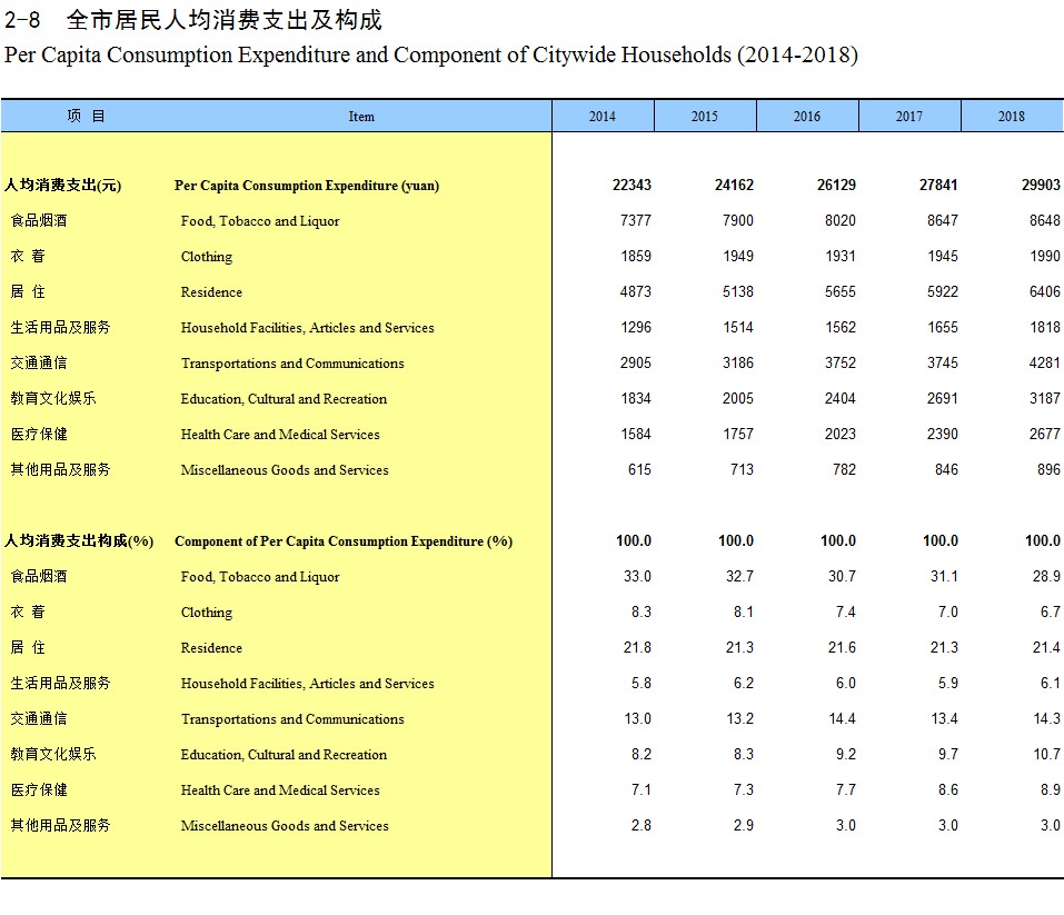 2-8 全市居民人均消费支出及构成(2014-2018)
