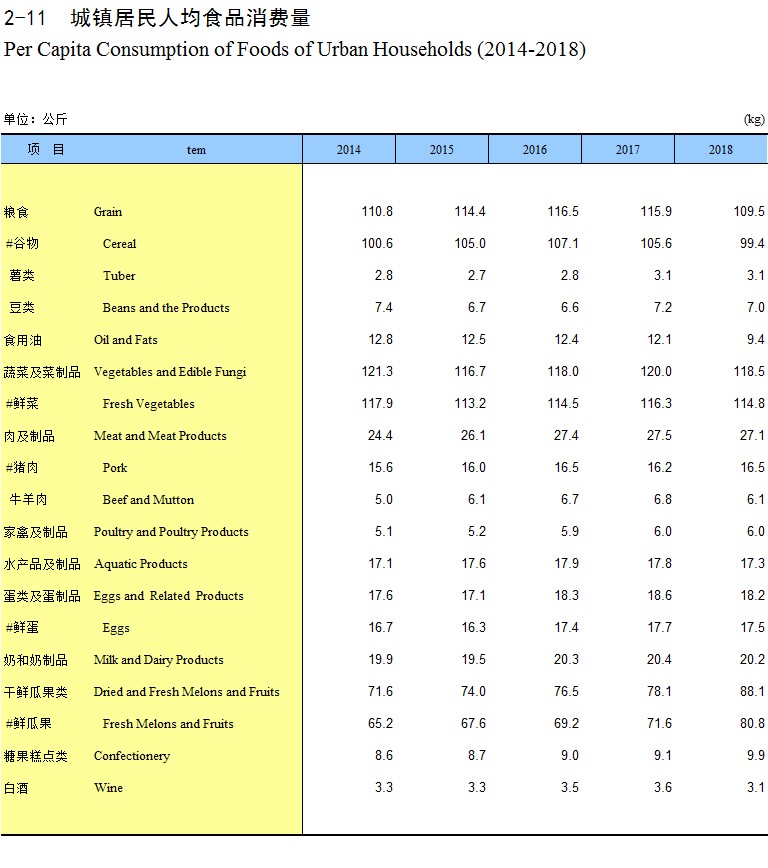 2-11 城镇居民人均食品消费量(2014-2018)