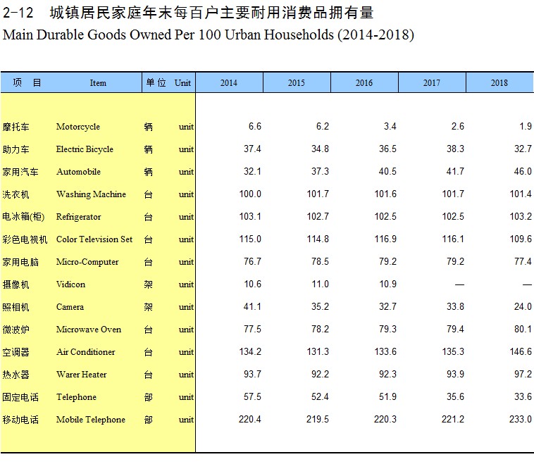 2-12 城镇居民家庭年末每百户主要耐用消费品拥有量(2014-2018)