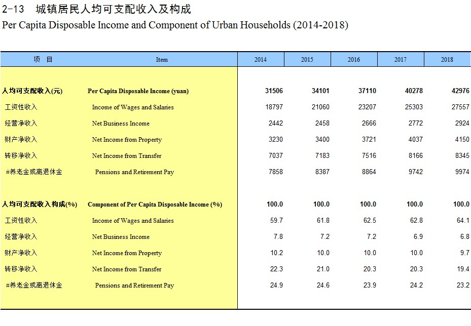 2-13 城镇居民人均可支配收入及构成(2014-2018)