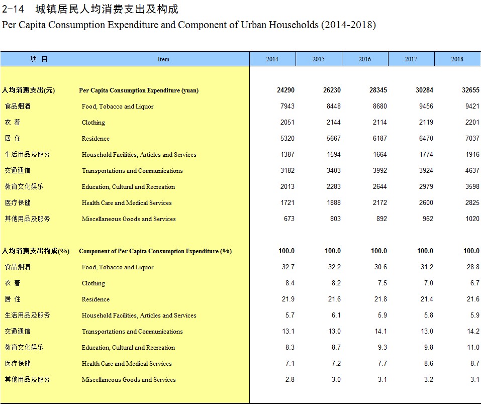 2-14 城镇居民人均消费支出及构成(2014-2018)