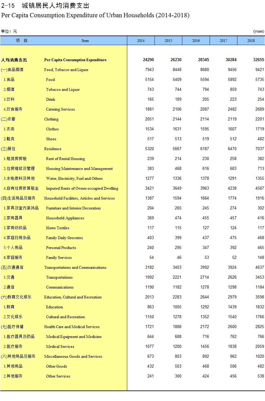2-15 城镇居民人均消费支出(2014-2018)