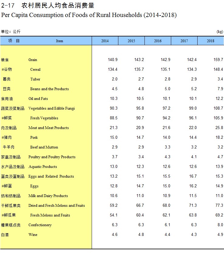 2-17 农村居民人均食品消费量(2014-2018)