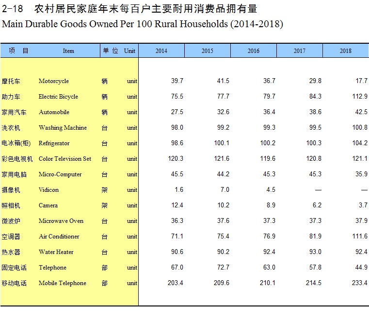 2-18 农村居民家庭年末每百户主要耐用消费品拥有量(2014-2018)