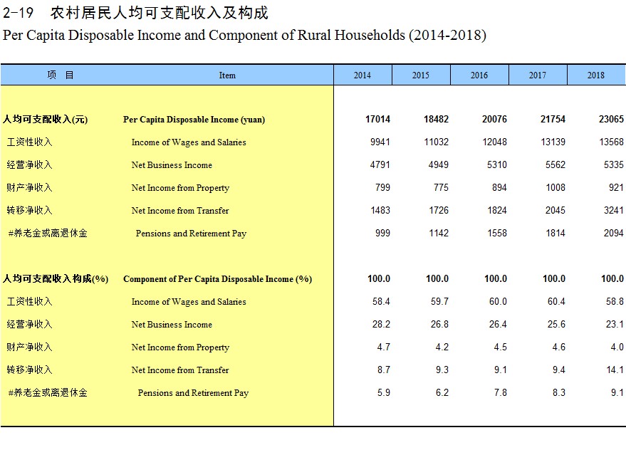 2-19 农村居民人均可支配收入及构成(2014-2018)