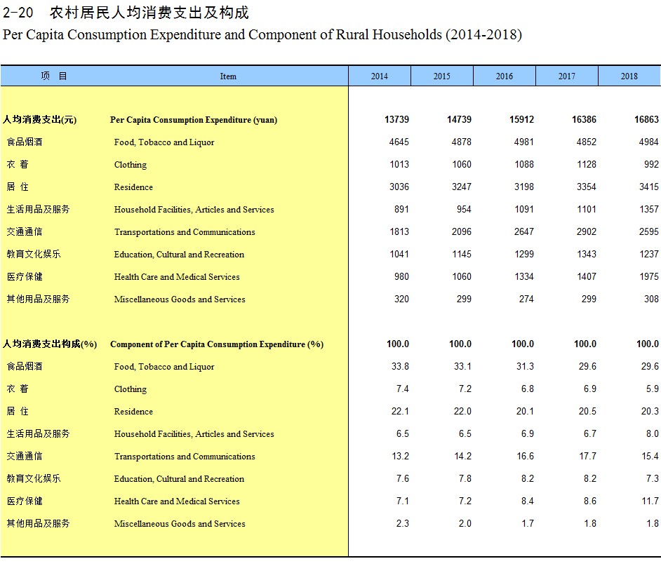 2-20 农村居民人均消费支出及构成(2014-2018)