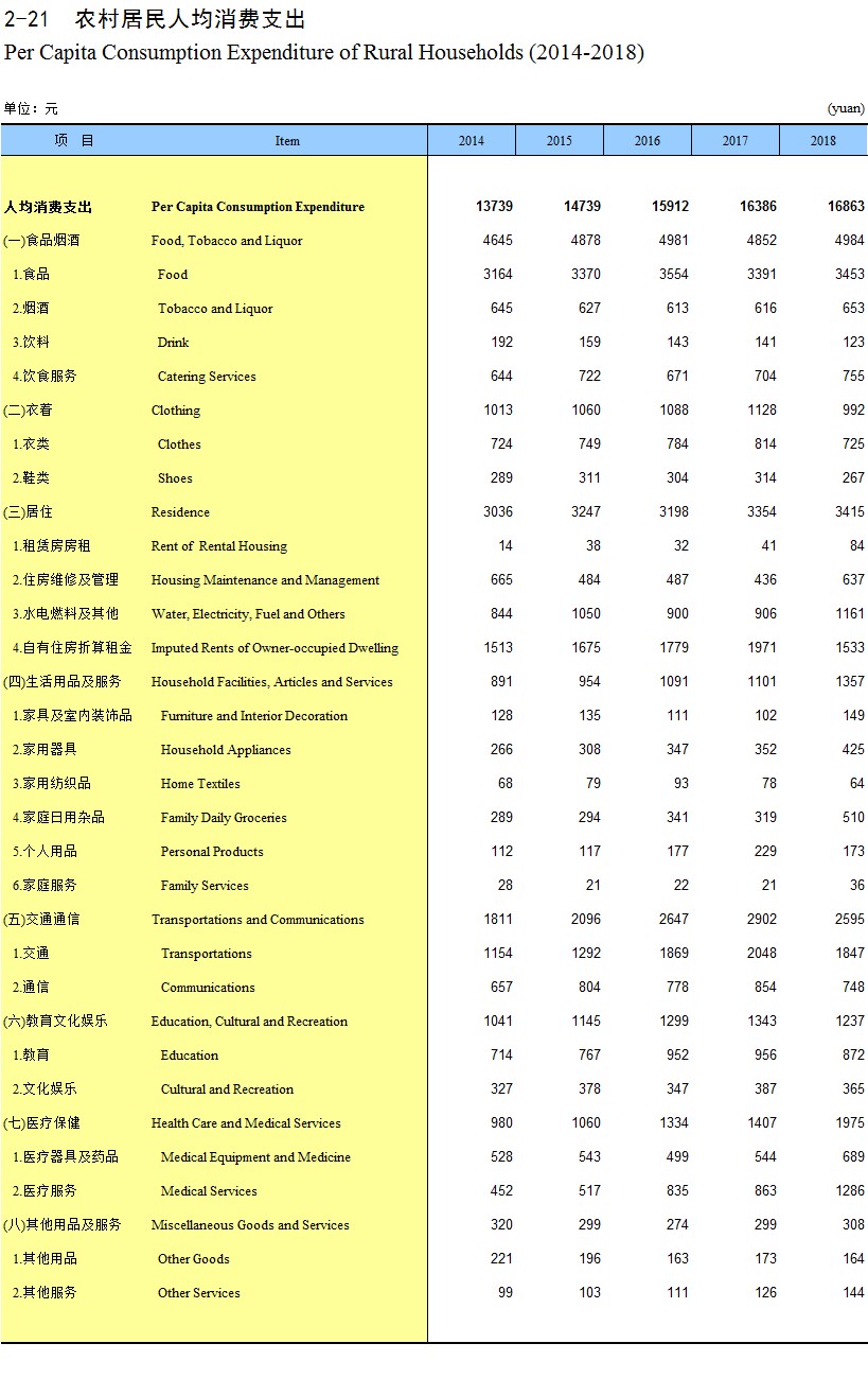 2-21 农村居民人均消费支出(2014-2018)