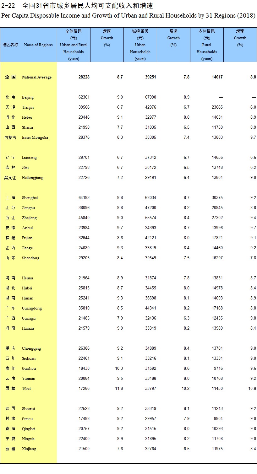 2-22 全国31省市城乡居民人均可支配收入和增速(2018)