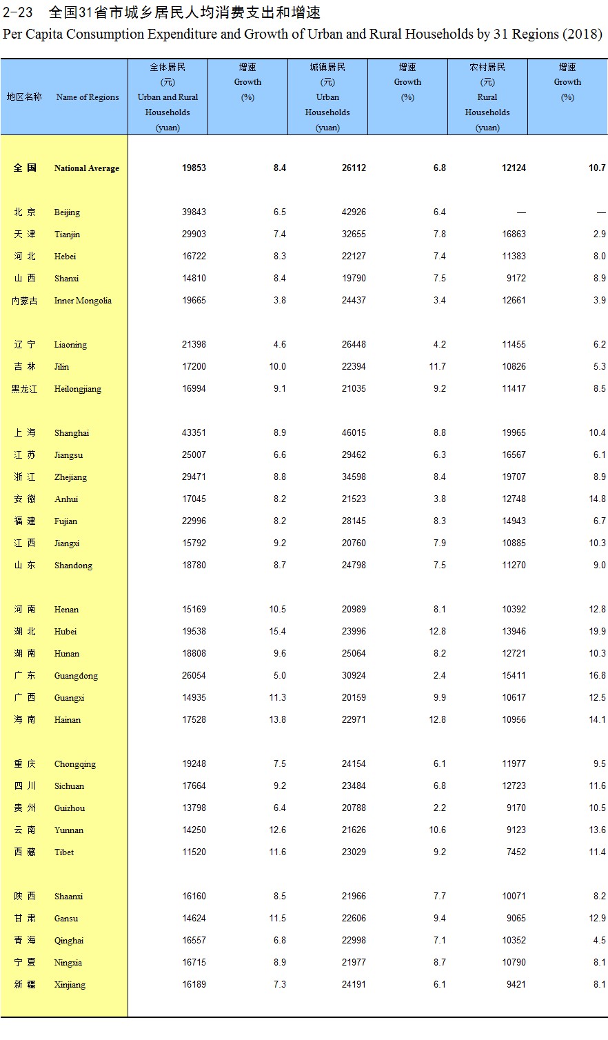 2-23 全国31省市城乡居民人均消费支出和增速(2018)