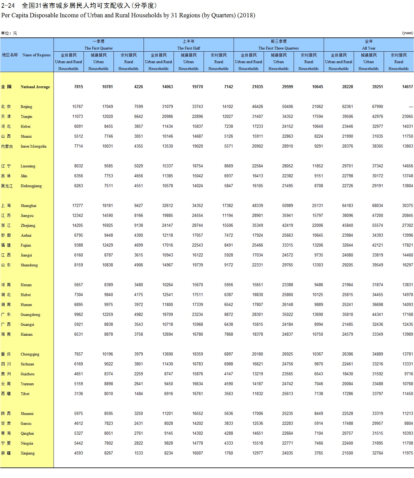2-24 全国31省市城乡居民人均可支配收入(分季度)(2018)