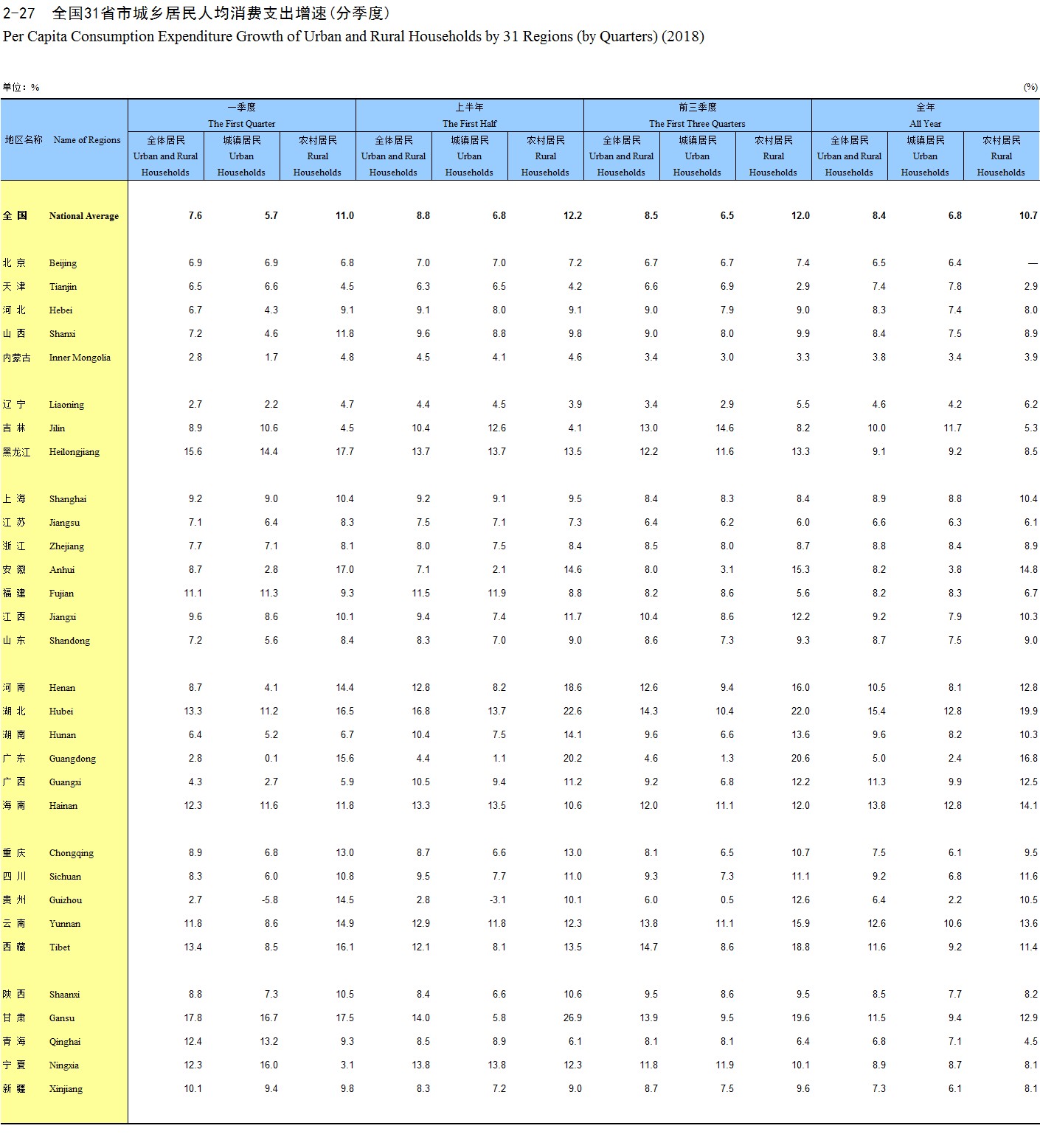 2-27 全国31省市城乡居民人均消费支出增速(分季度)(2018)