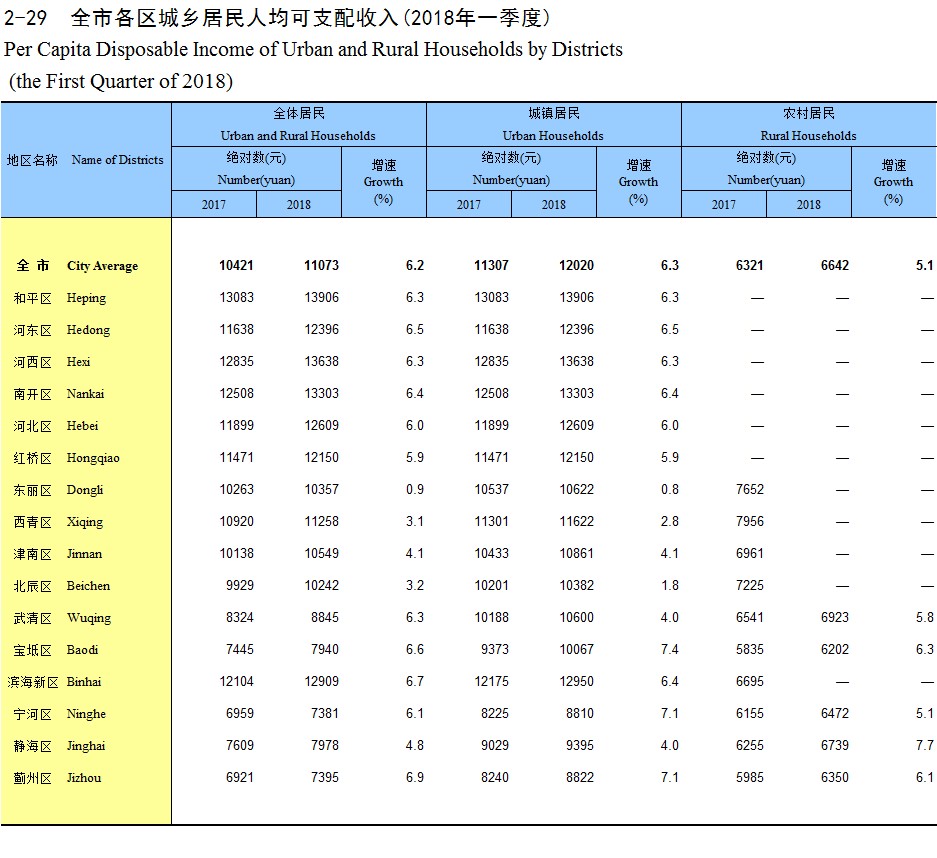 2-29 全市各区城乡居民人均可支配收入(2018年一季度)