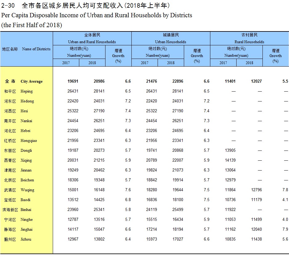2-30 全市各区城乡居民人均可支配收入(2018年上半年)