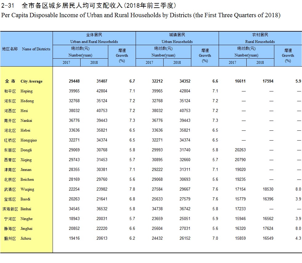 2-31 全市各区城乡居民人均可支配收入(2018年前三季度)