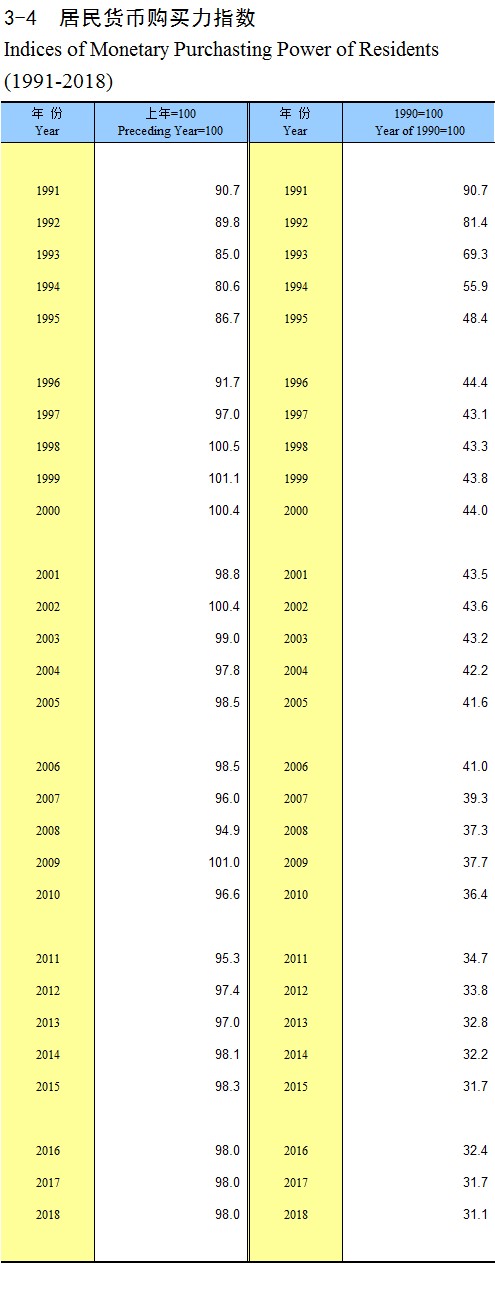 3-4 居民货币购买力指数(1991-2018)