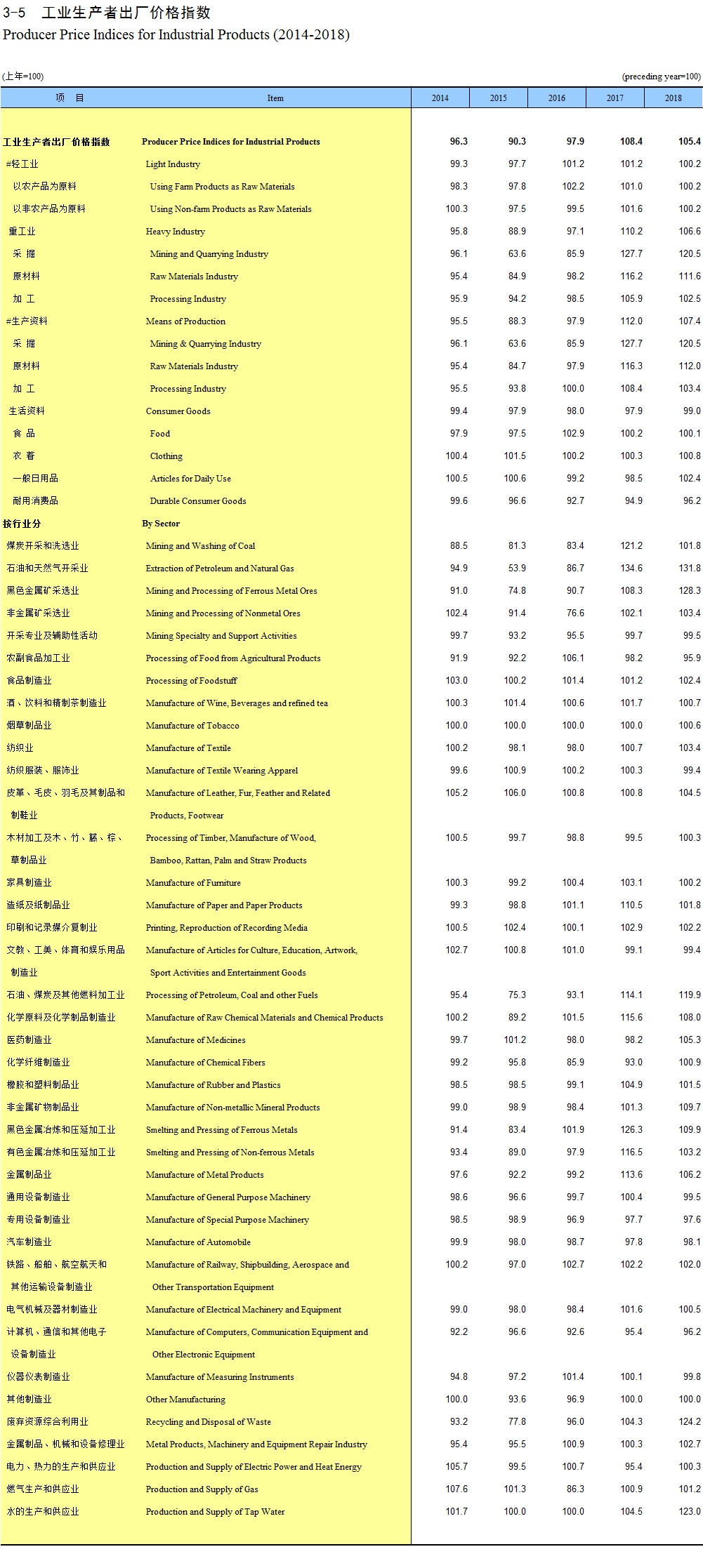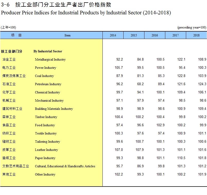 3-6 按工业部门分工业生产者出厂价格指数(2014-2018)