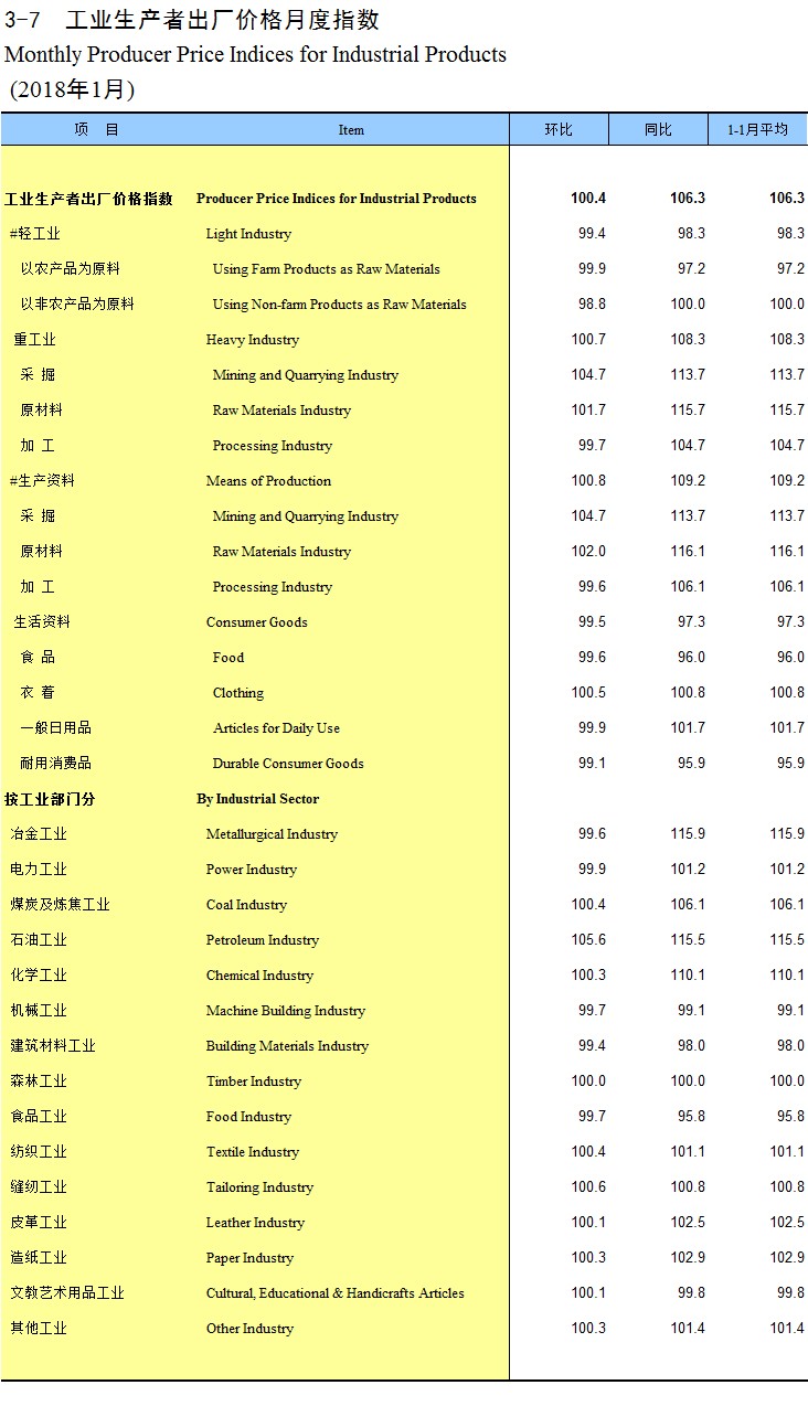 3-7 工业生产者出厂价格月度指数(2018年1月)