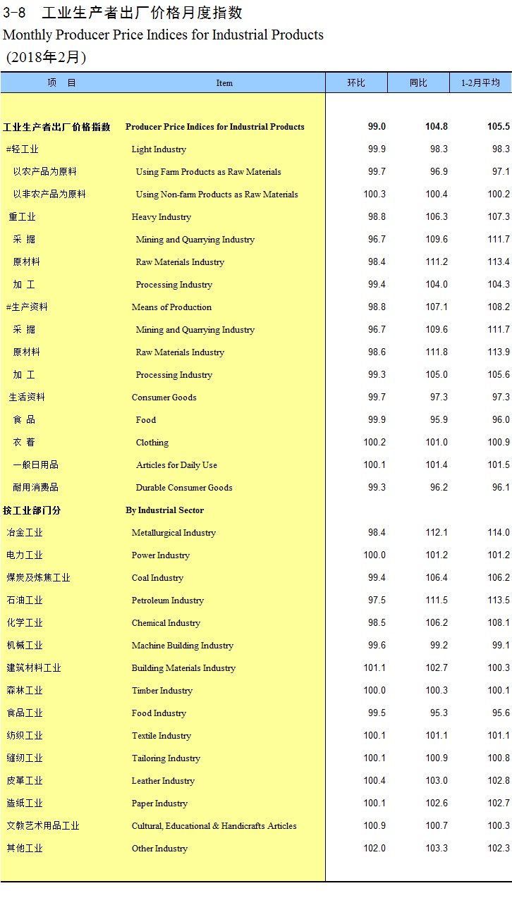 3-8 工业生产者出厂价格月度指数(2018年2月)