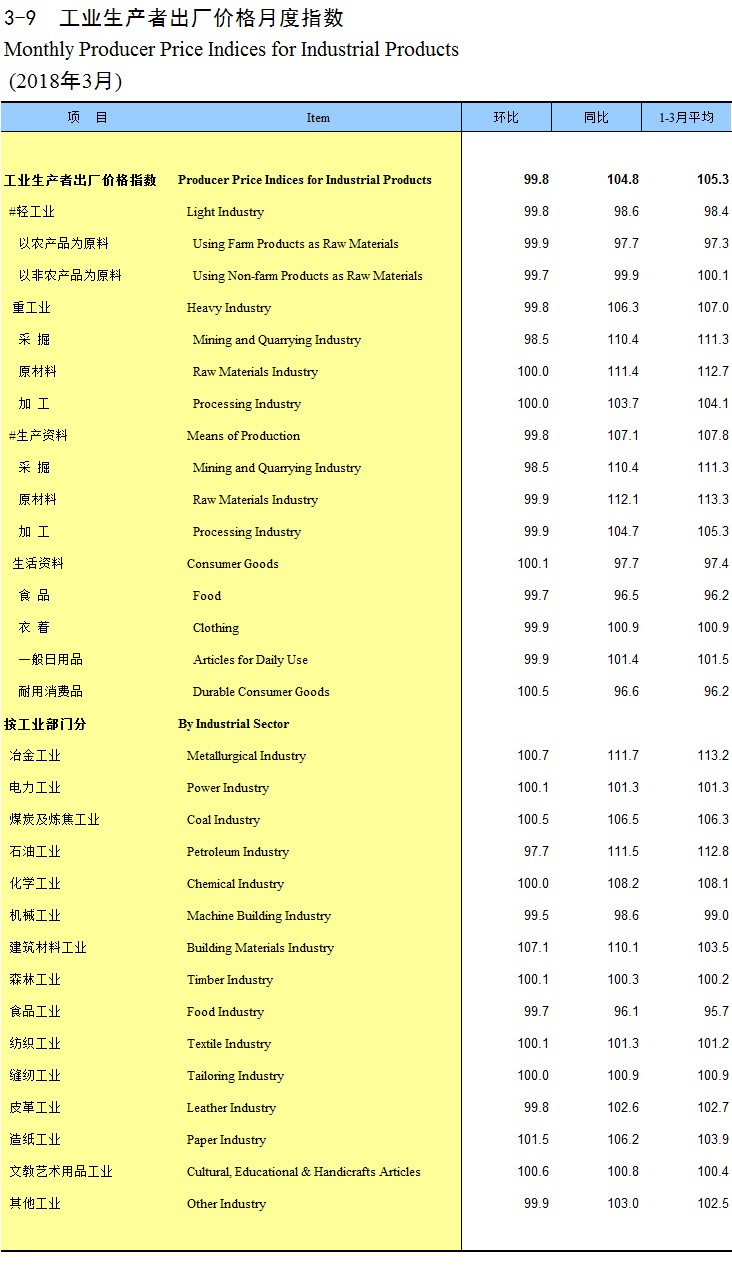 3-9 工业生产者出厂价格月度指数(2018年3月)