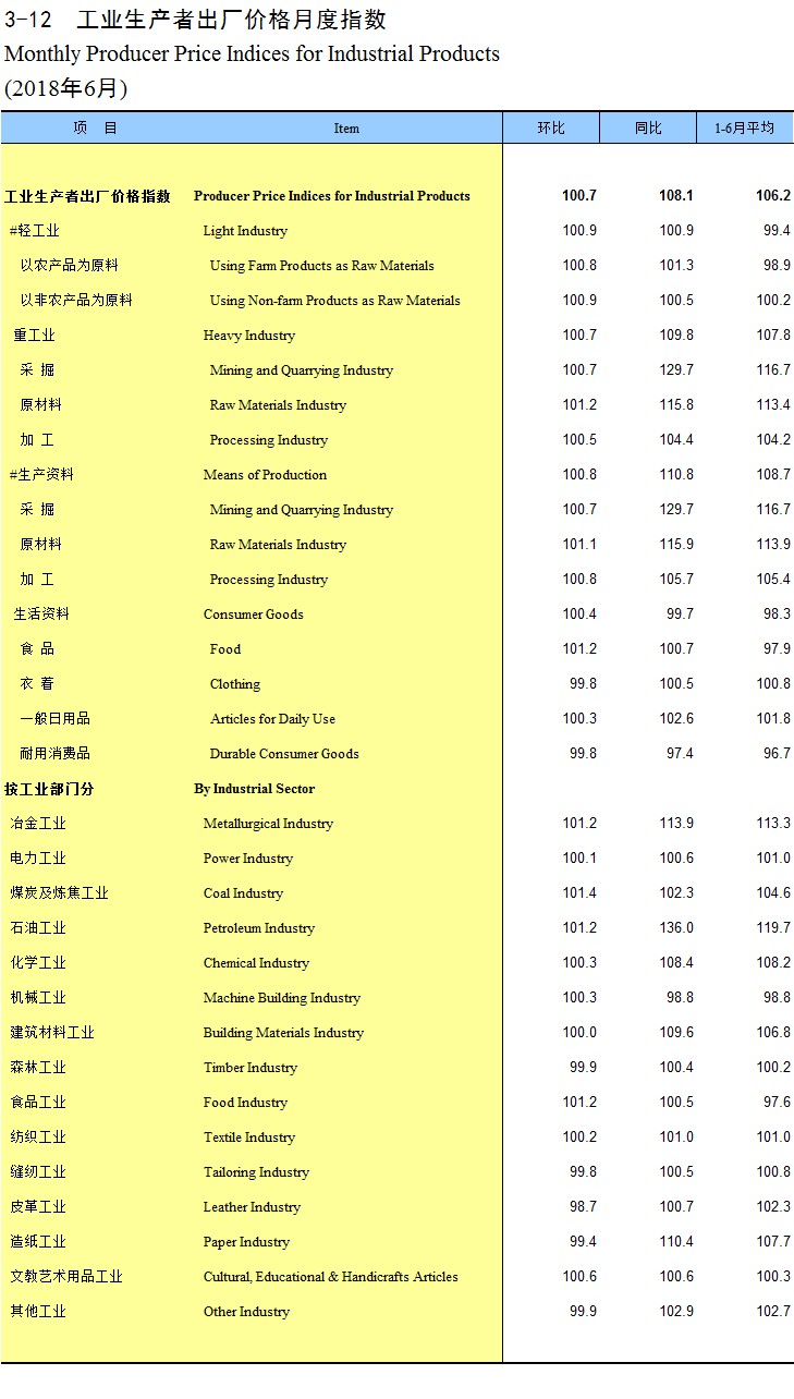 3-12 工业生产者出厂价格月度指数(2018年6月)