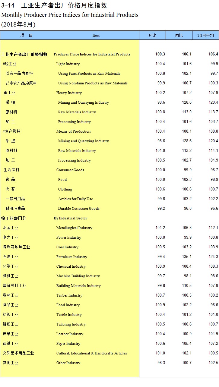 3-14 工业生产者出厂价格月度指数(2018年8月)