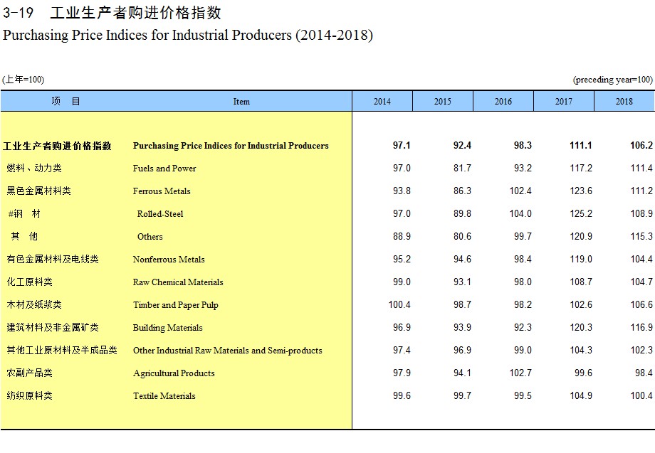 3-19 工业生产者购进价格指数(2014-2018)