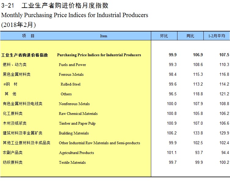 3-21 工业生产者购进价格月度指数(2018年2月)