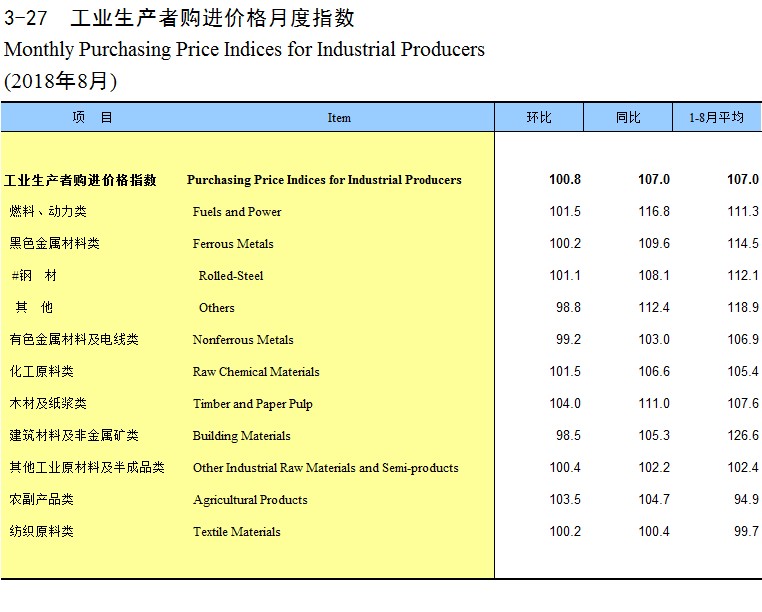 3-27 工业生产者购进价格月度指数(2018年8月)