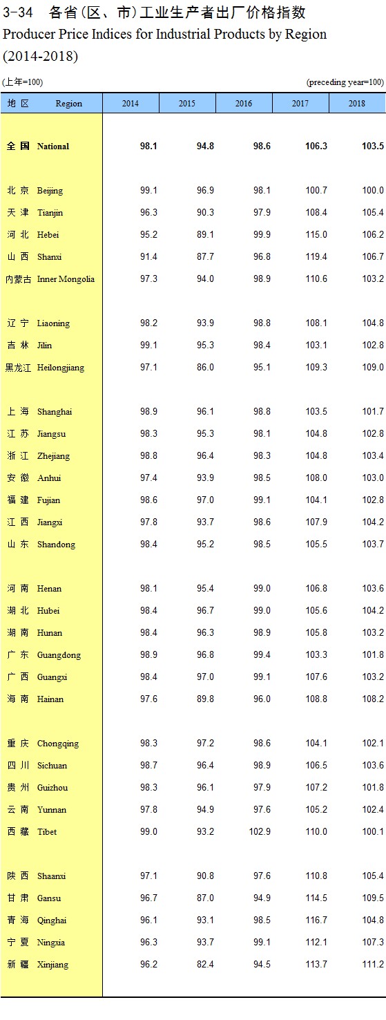 3-34 各省(区、市)工业生产者出厂价格指数(2014-2018)