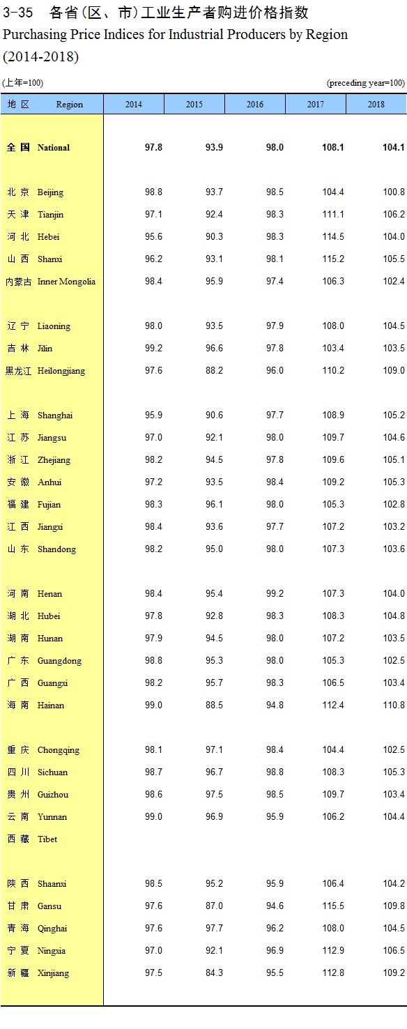3-35 各省(区、市)工业生产者购进价格指数(2014-2018)