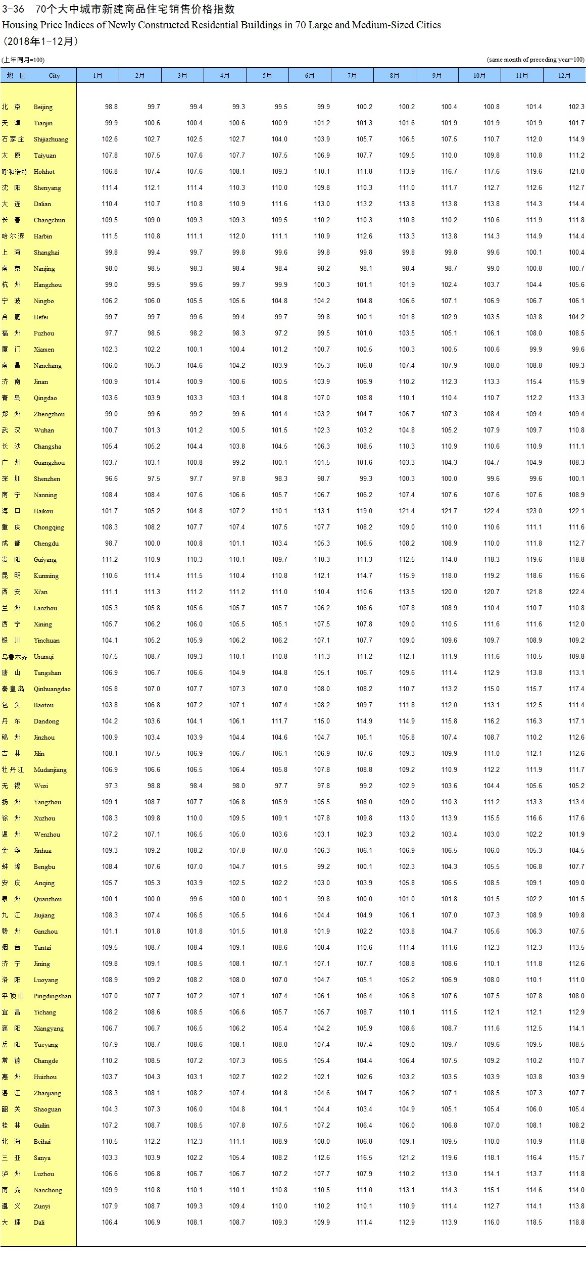 3-36 70个大中城市新建商品住宅销售价格指数(2018年1-12月)