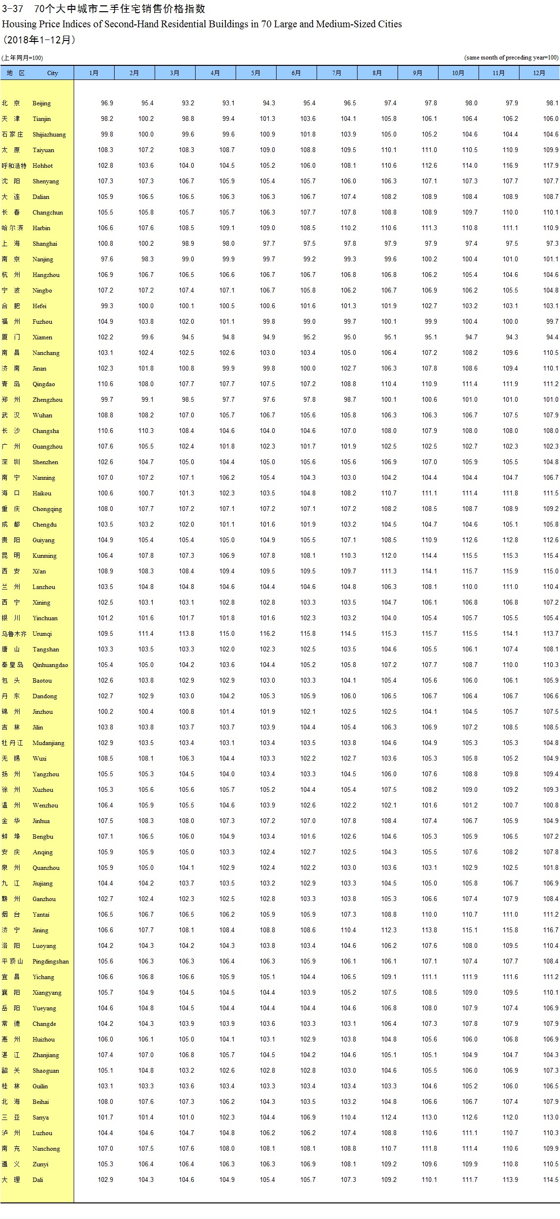 3-37 70个大中城市二手住宅销售价格指数(2018年1-12月)