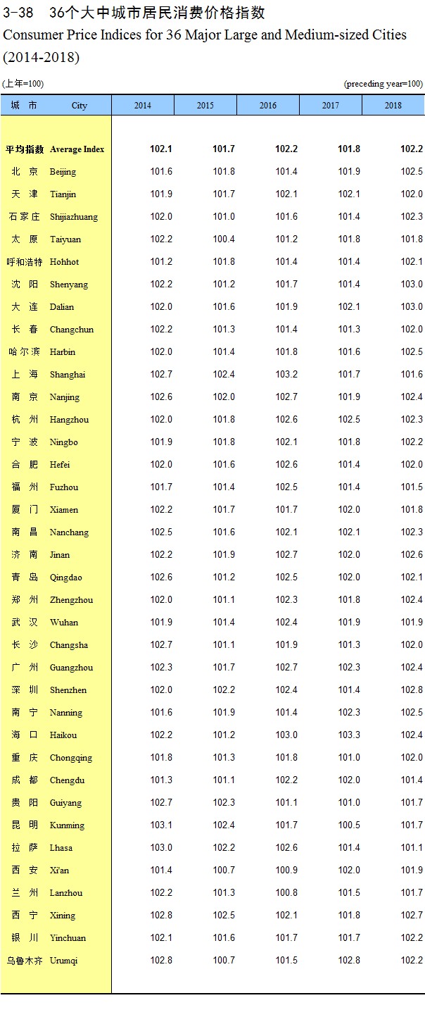 3-38 36个大中城市居民消费价格指数(2014-2018)