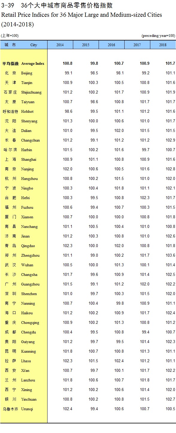3-39 36个大中城市商品零售价格指数(2014-2018)