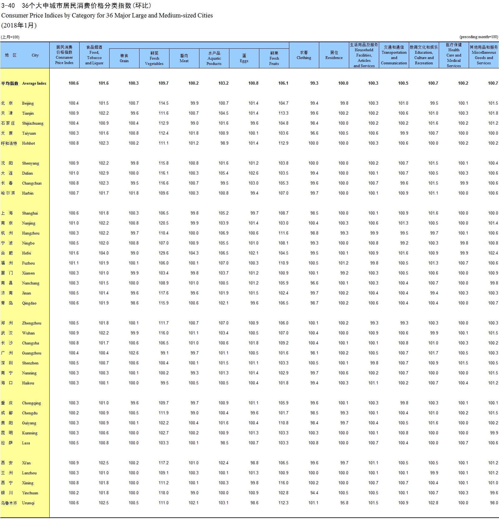 3-40 36个大中城市居民消费价格分类指数(环比)(2018年1月)