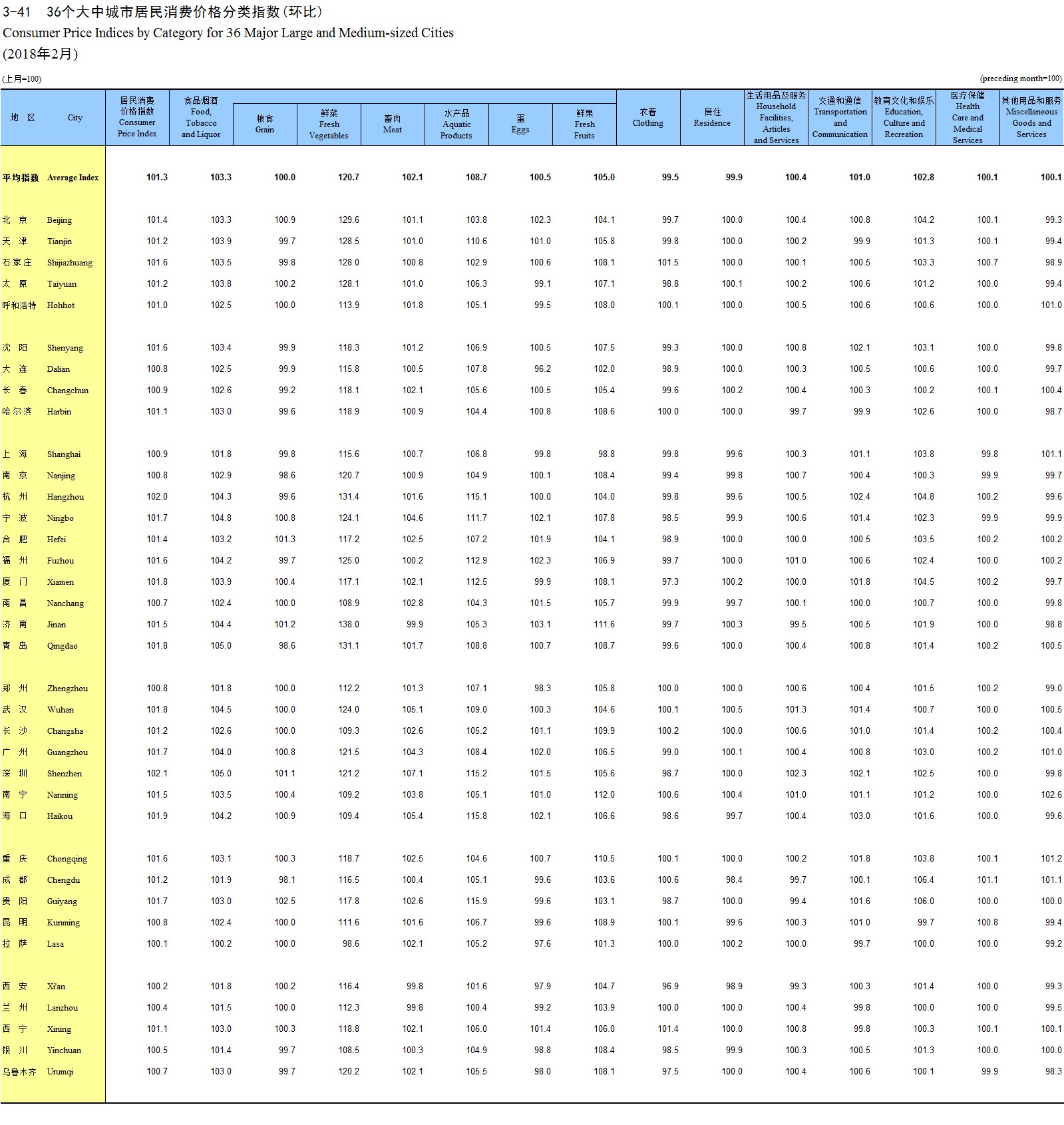 3-41 36个大中城市居民消费价格分类指数(环比)(2018年2月)