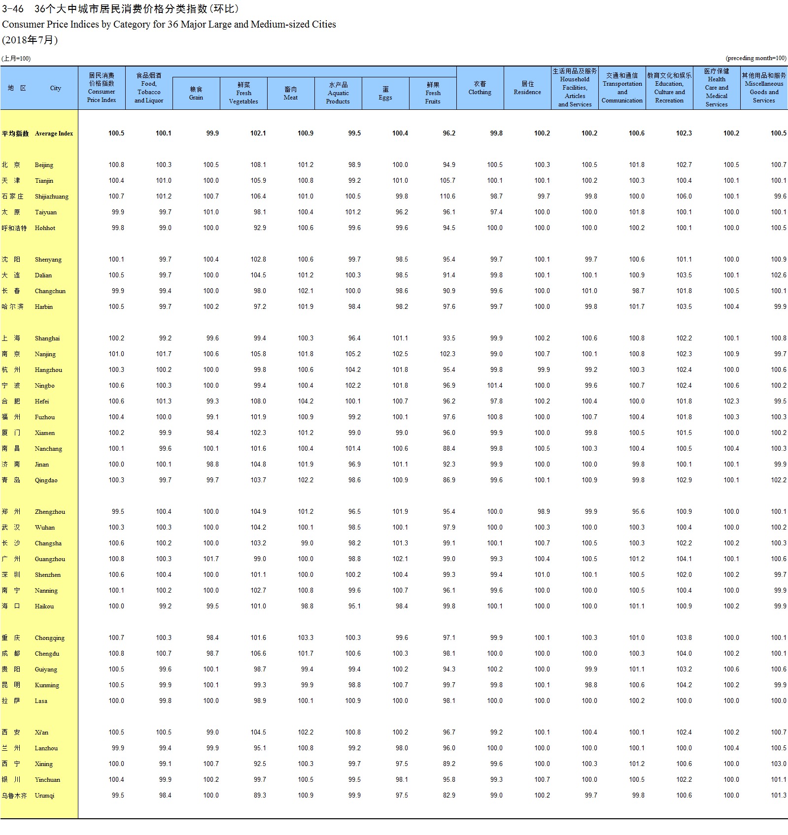 3-58 36个大中城市居民消费价格分类指数(同比)(2018年7月)