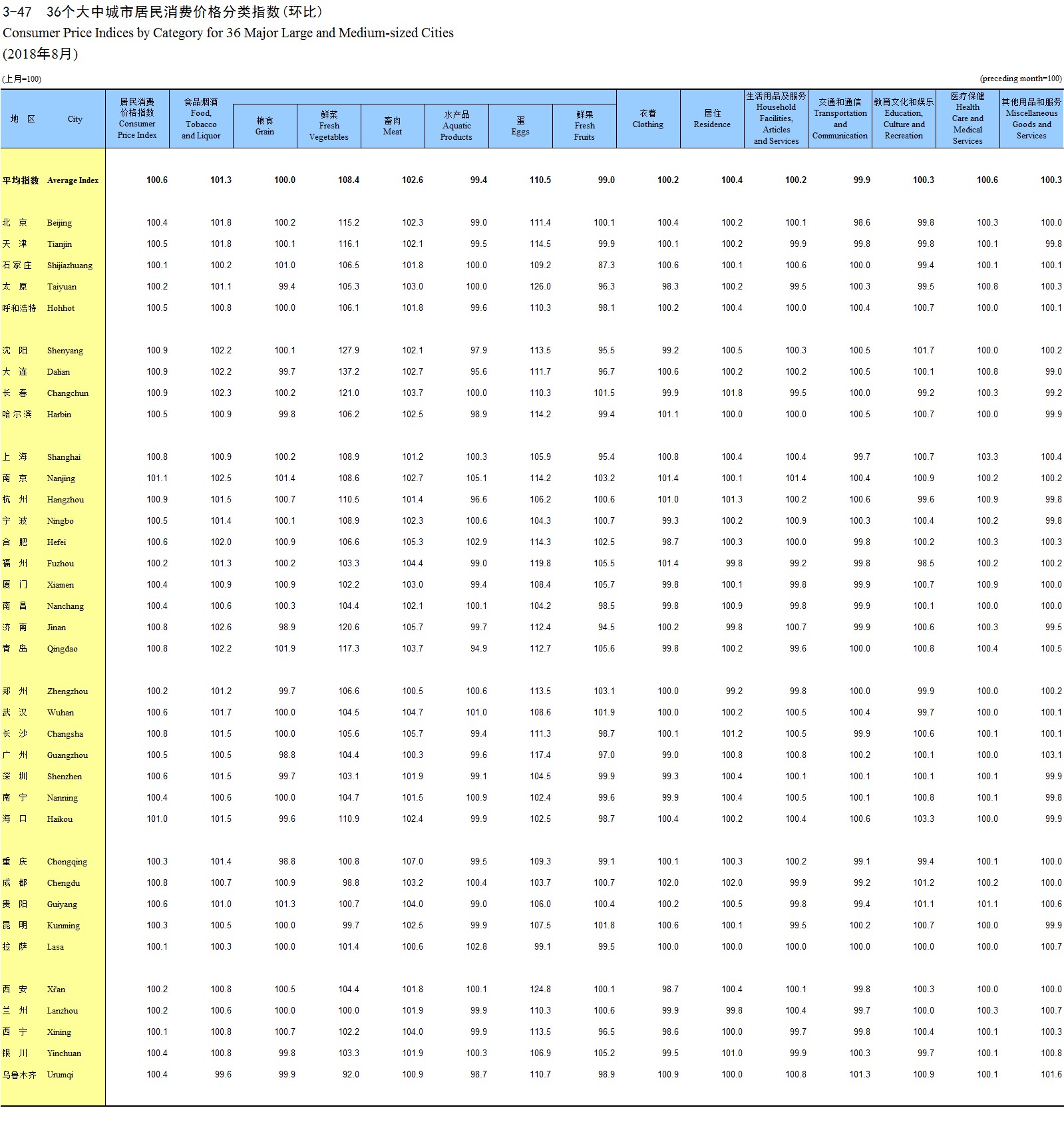 3-47 36个大中城市居民消费价格分类指数(环比)(2018年8月)