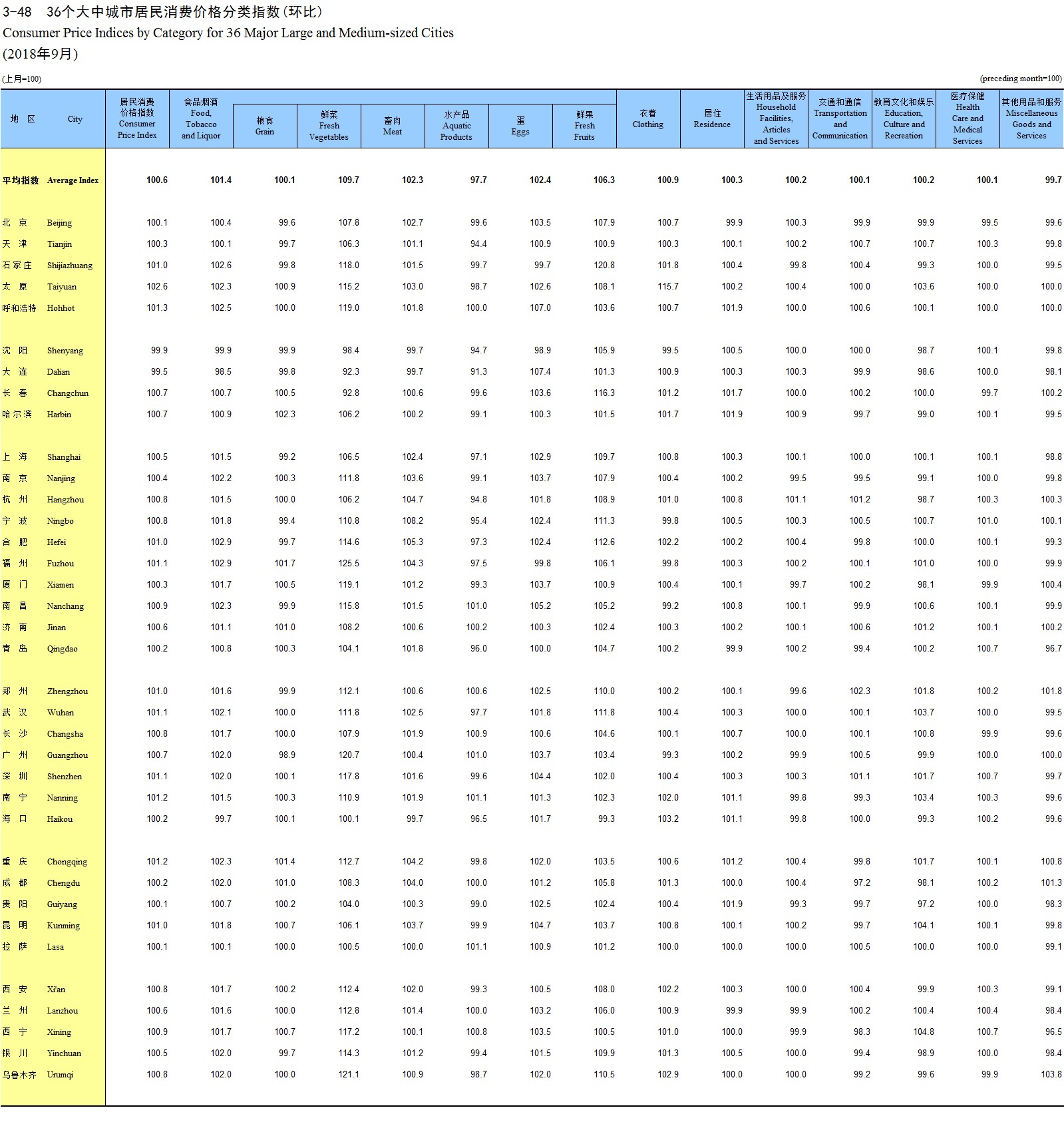 3-48 36个大中城市居民消费价格分类指数(环比)(2018年9月)