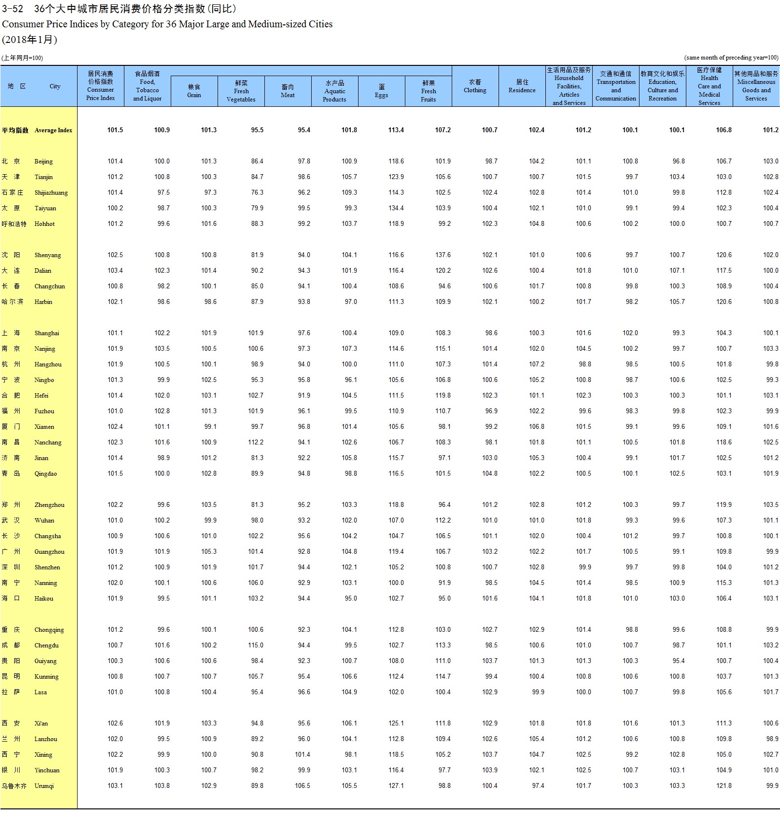 3-52 36个大中城市居民消费价格分类指数(同比)(2018年1月)
