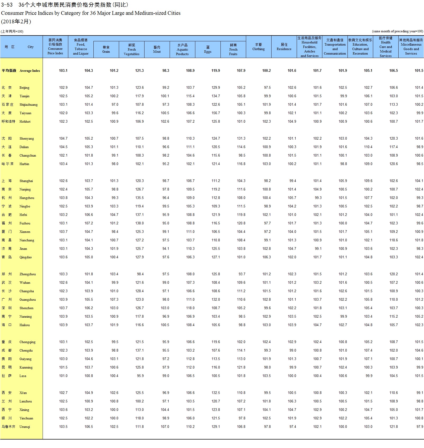 3-53 36个大中城市居民消费价格分类指数(同比)(2018年2月)