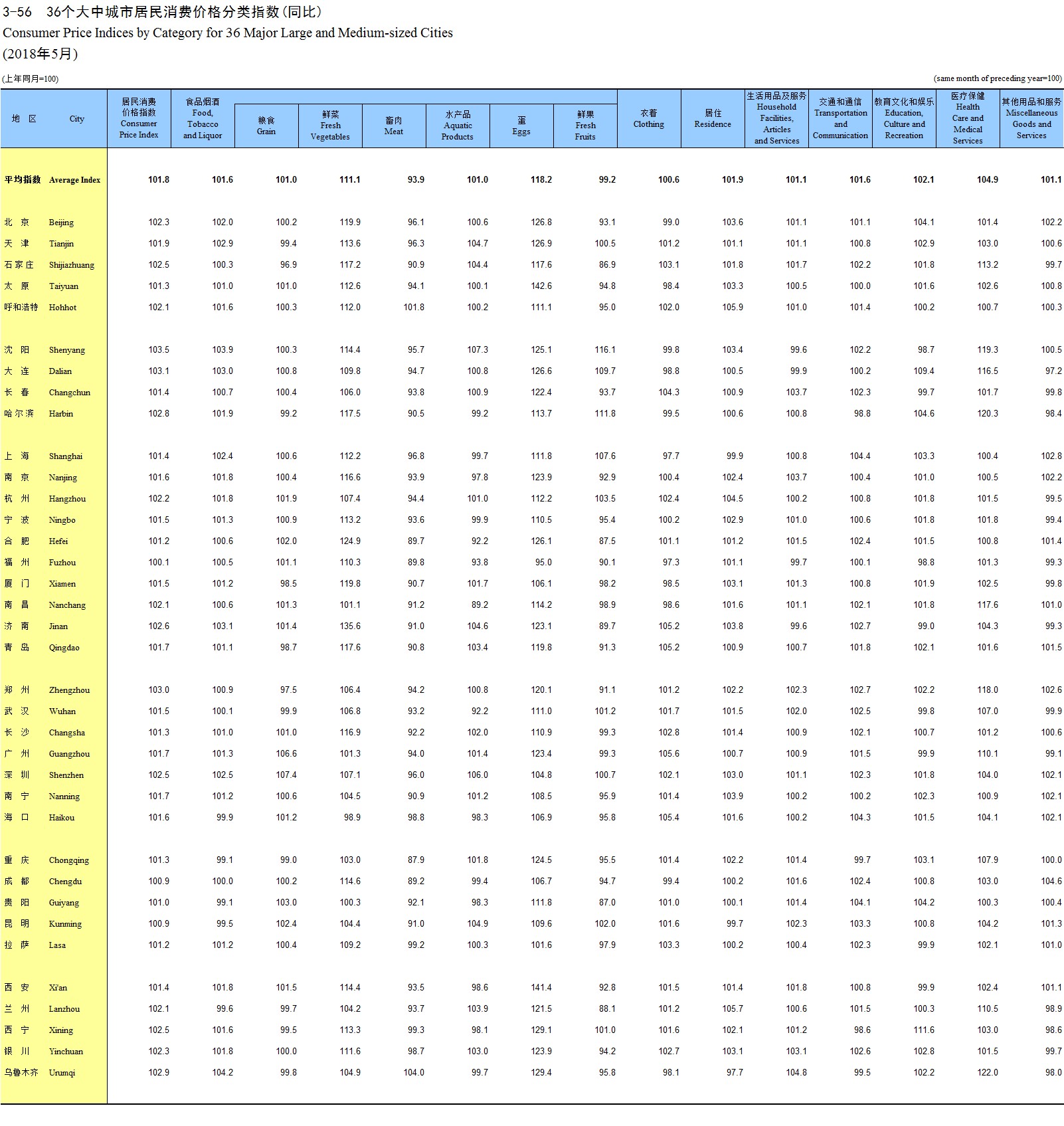 3-56 36个大中城市居民消费价格分类指数(同比)(2018年5月)
