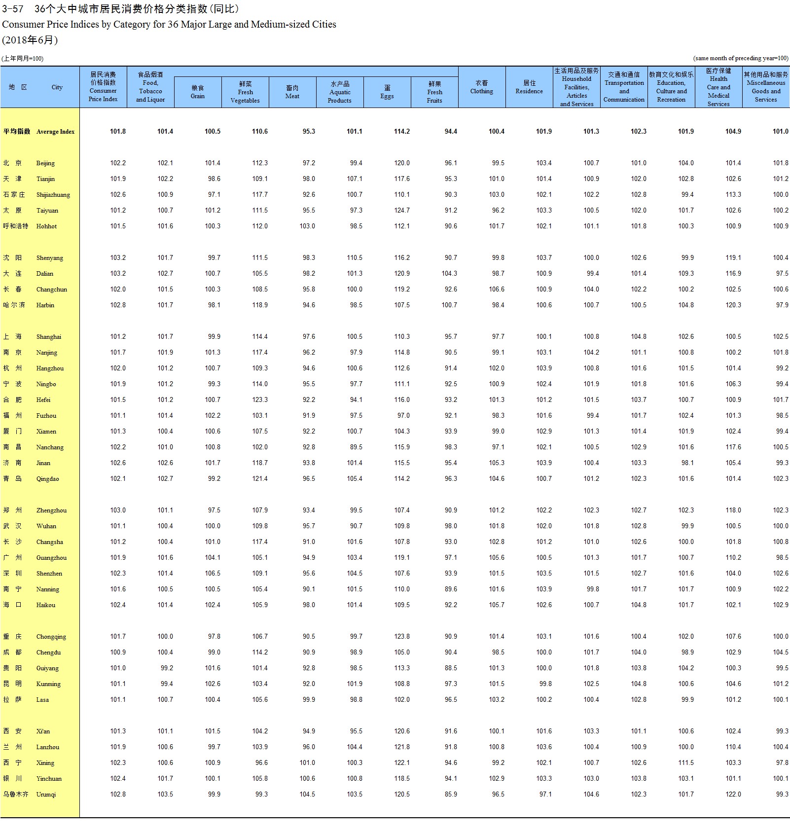 3-57 36个大中城市居民消费价格分类指数(同比)(2018年6月)