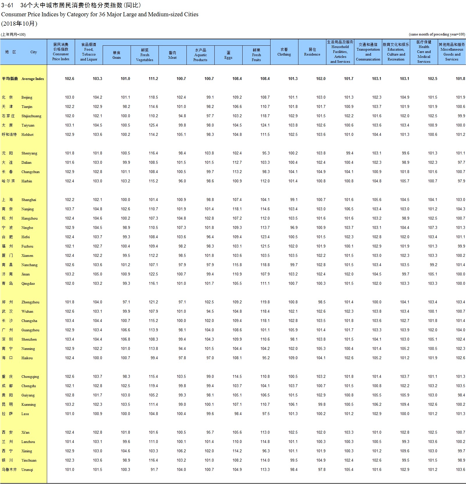 3-61 36个大中城市居民消费价格分类指数(同比)(2018年10月)